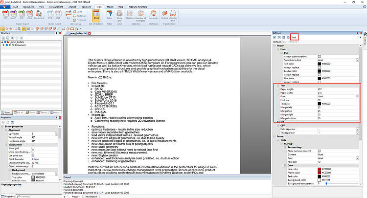 3DViewStation also supports 2D file formats, incl. text files. These text files frequently are generated automatically, without any layout. We now added settings to specify i.e. paper size, borders etc. in order to format such text files on screen.