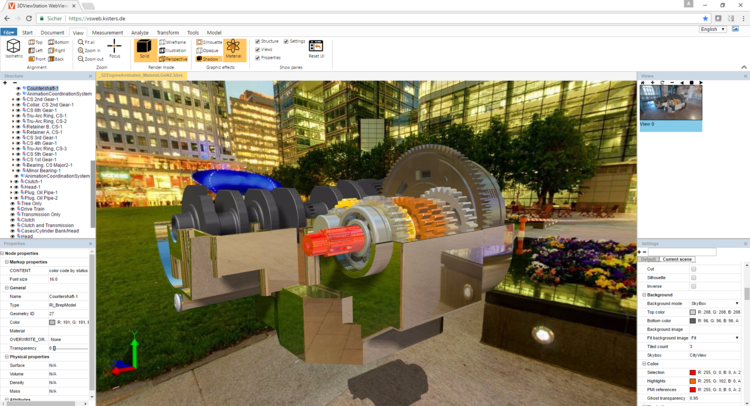 “Kisters 3DViewStation provides an ultra fast rendering engine for 3D CAD data of various sources, allowing to render shaded, with wire frames and in illustration mode” said Jim Eardly, Kisters North America Sales Manager.   “Most recent additions allow to render close to photo realistic in real time, by adding materials, background images and skyboxes, which influence reflections.”